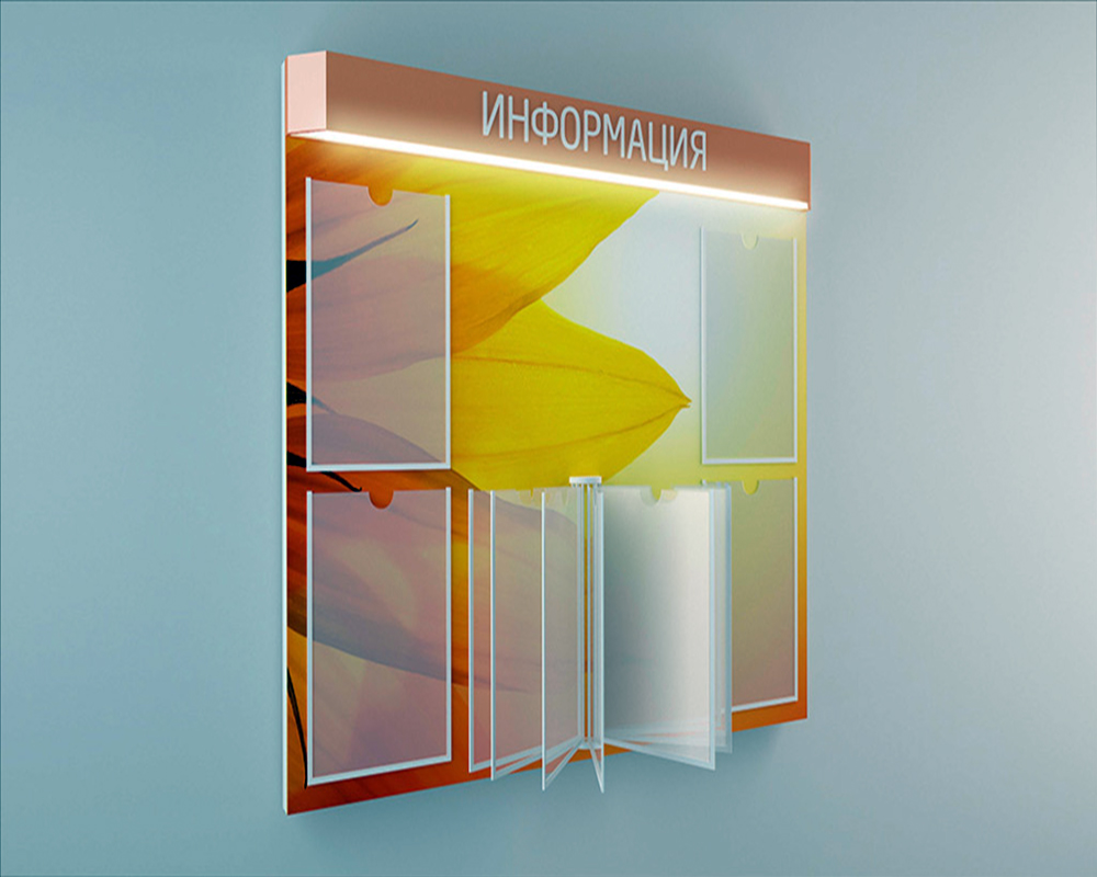 В нашей компании Вы можете купить информационные стенды любых видов и назначений: уличные и интерьерные, напольные и настенные, с карманами, пробкой или напечатанным изображением. Также осуществляем изготовление и монтаж с установкой стандартных стендов «Уголок потребителя» и «Информация». Собственное производство на каждой технологической операции позволяет нам изготовить информационные стенды совершенно недорого, при этом обеспечивая безупречное качество изделий на выходе из производственного цеха. Бонусом мы всегда готовы очень дешево, а часто и совершенно бесплатно разработать дизайн-проект будущего стенда, обеспечив грамотное оформление согласно всех современных тенденций, требований брендбука, а также особенностей интерьера, в котором планируется размещение информационного стенда.
